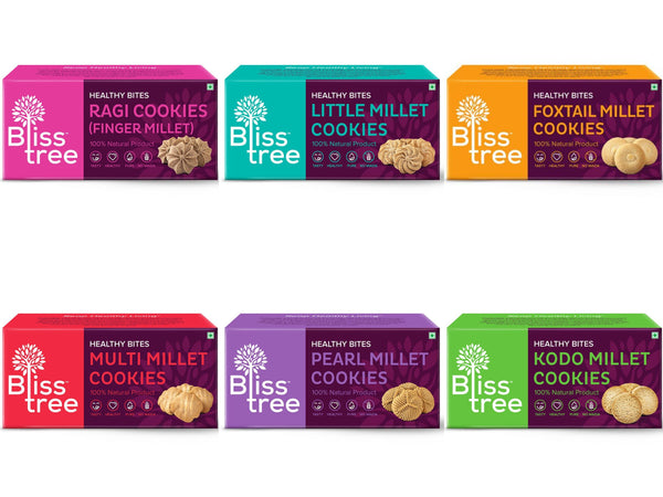 6 packs contains 1 x Foxtail Cookies, 1 x Kodo Cookies, 1 x Little Cookies, 1 x Multi-Millet Cookies, 1 x Ragi Cookies and 1 x Pearl Cookies (75g each)...